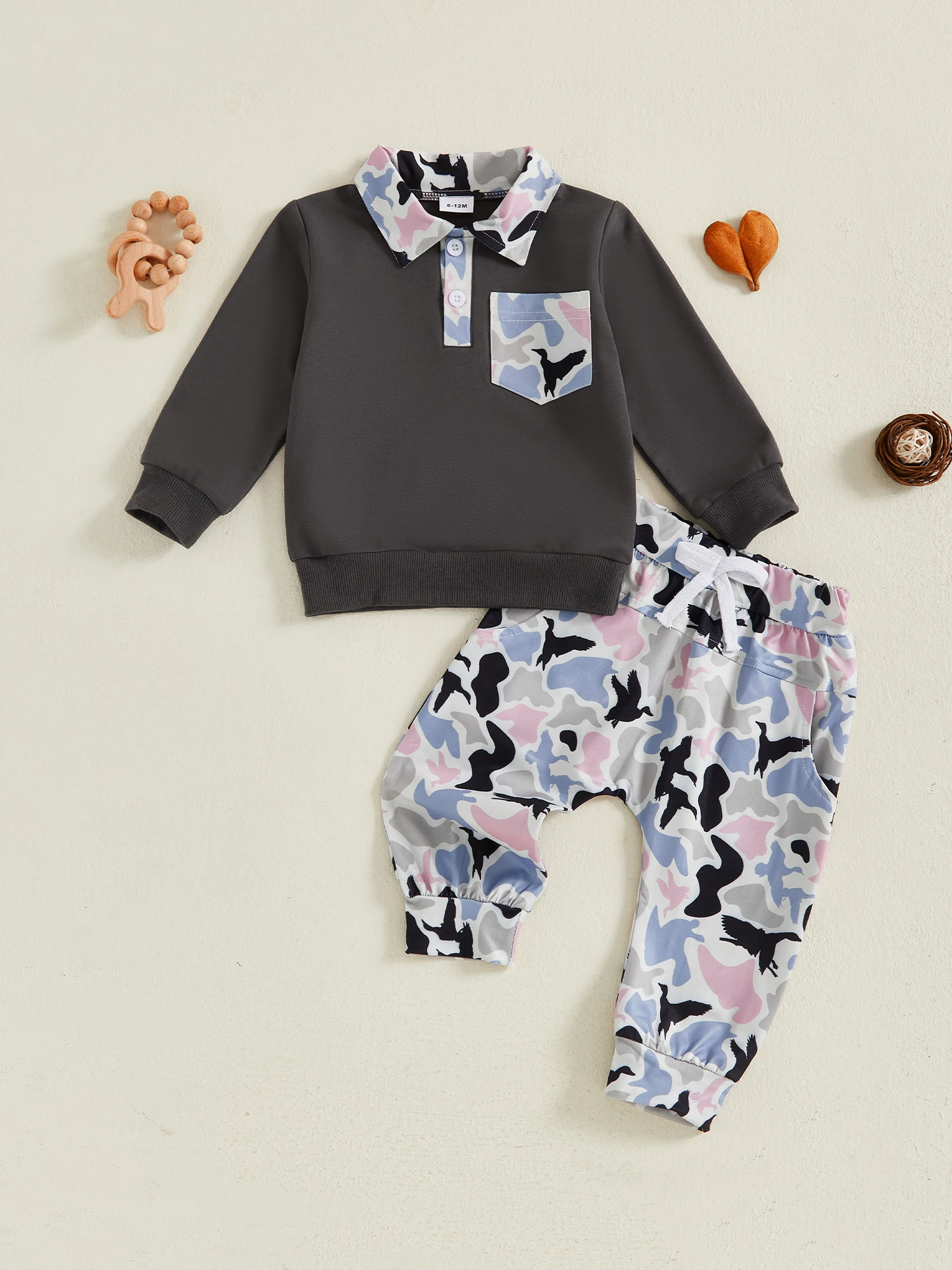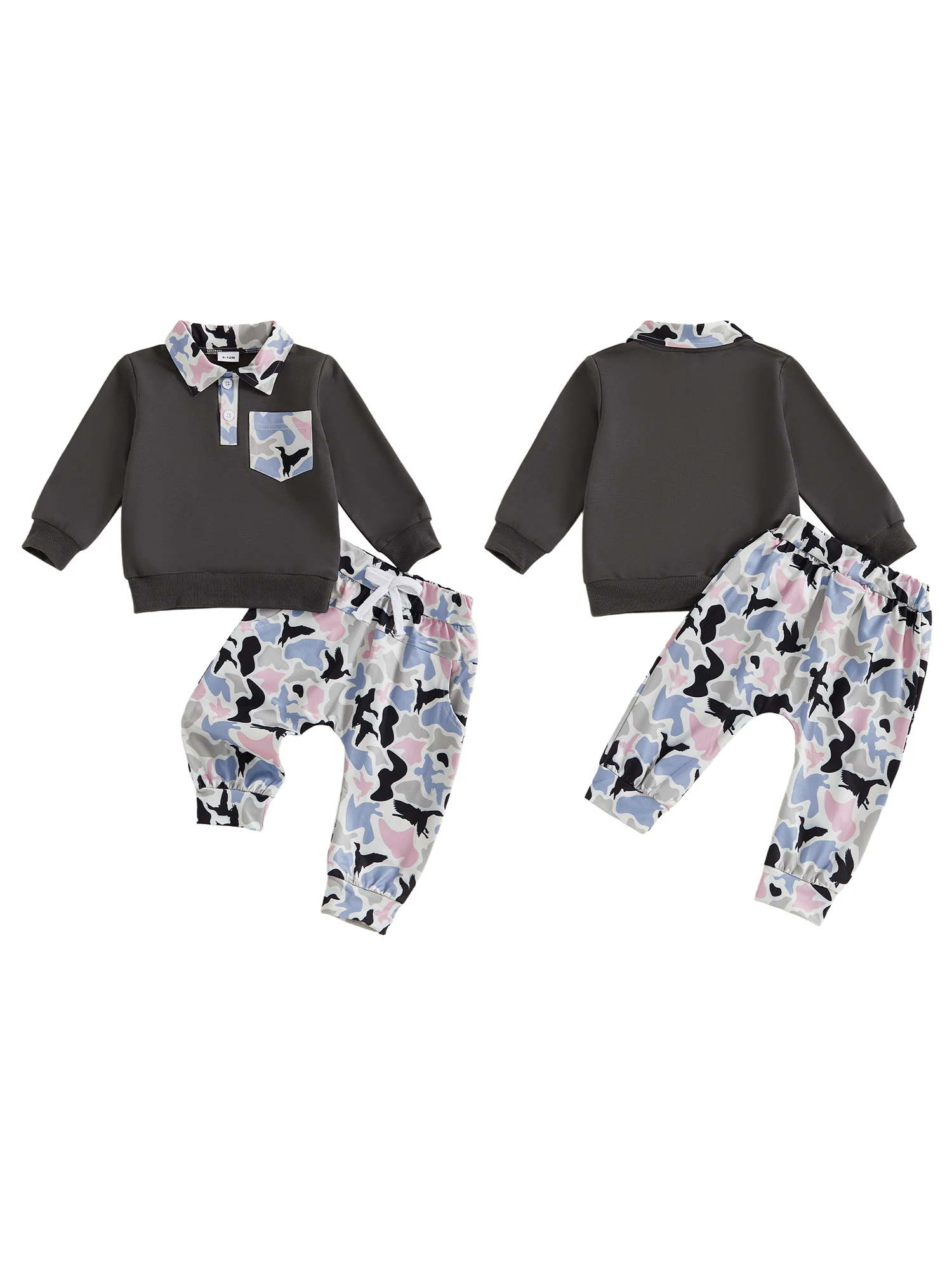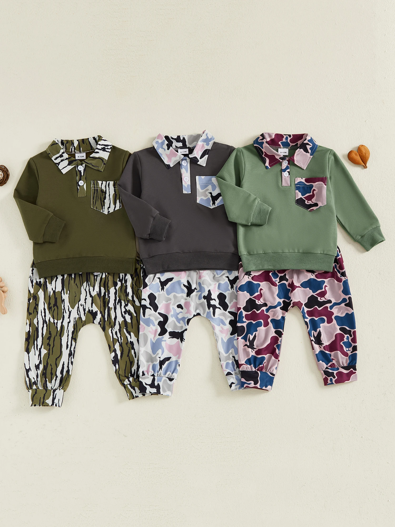 Toddler Baby Boys Clothes Set Fashionable Long Sleeve Lapel Tops with Camouflage Pants 2 Pcs Fall Outfits
