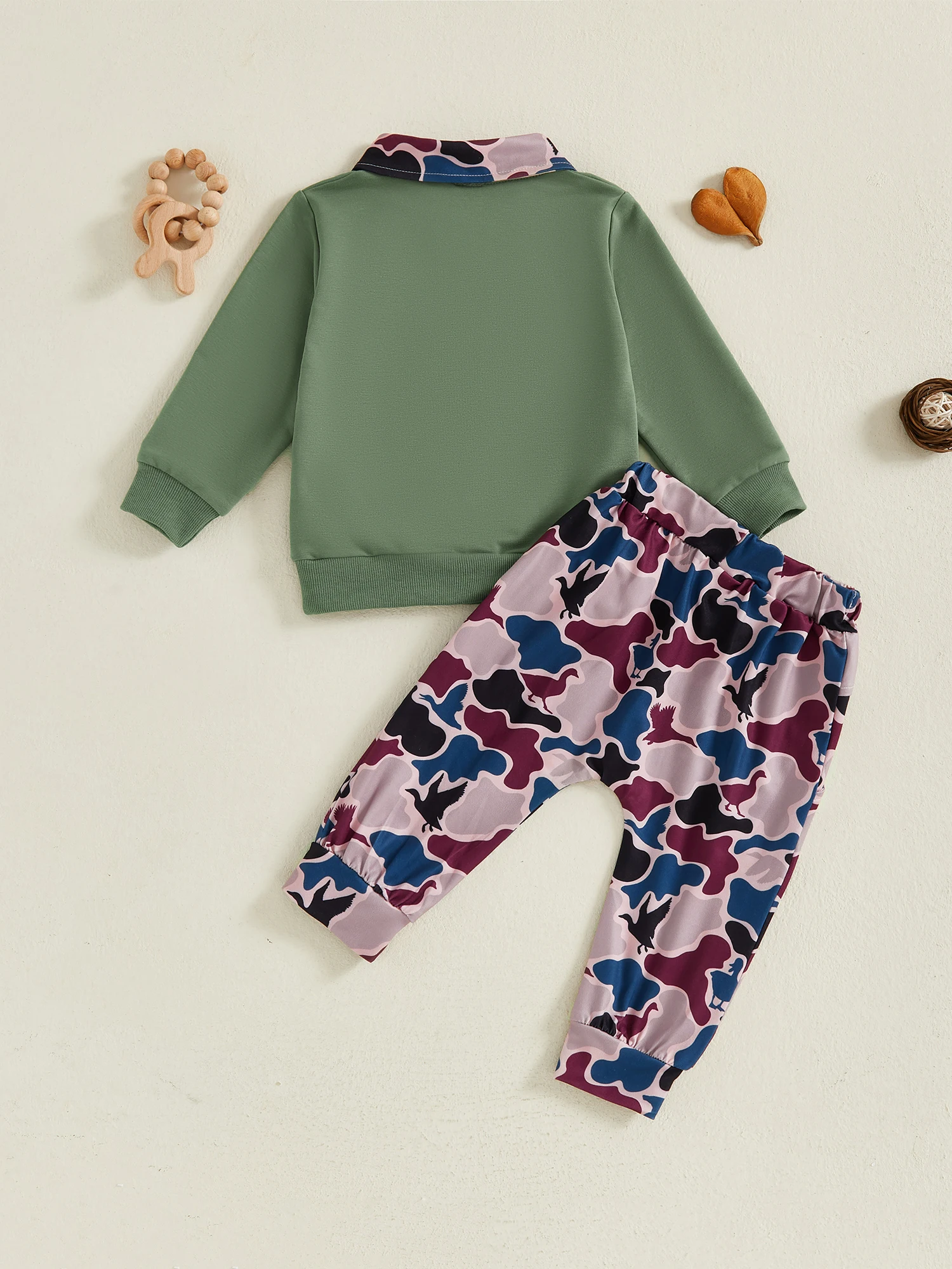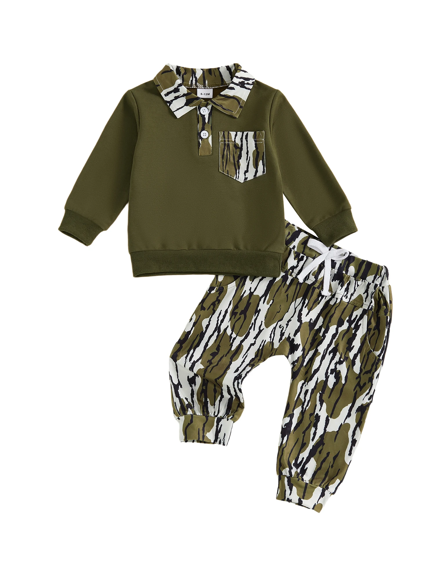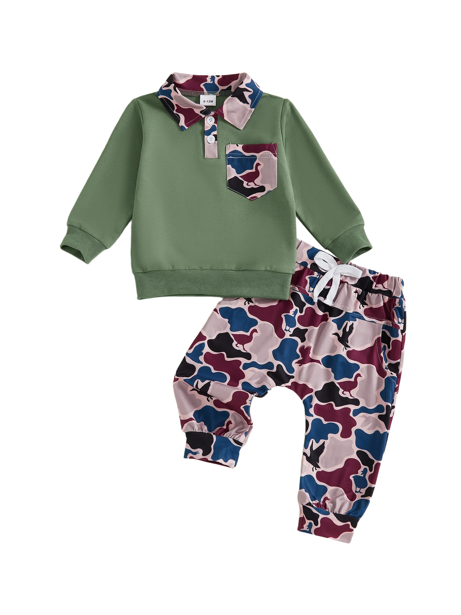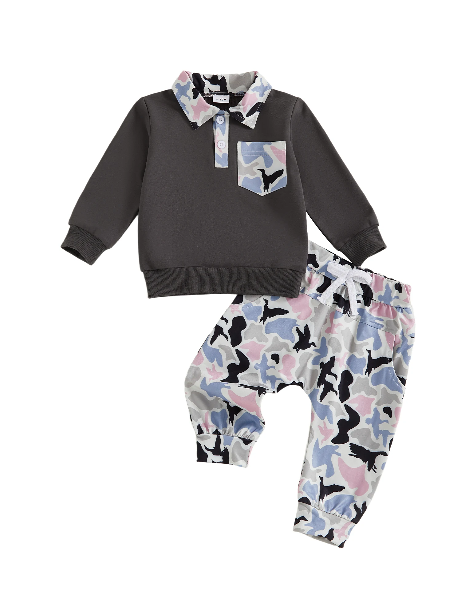 Toddler Baby Boys Clothes Set Fashionable Long Sleeve Lapel Tops with Camouflage Pants 2 Pcs Fall Outfits